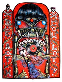University in Montreal. The courses here were what I would consider the only formal training I have had . Life drawing was mandatory in Character Design .What I took with me from learning about traditional cel animation is the level of work involved , the high output of art helped me on my way to happiness ...until I quit in 2nd year and started working in "the field", which was a post production job , and in that particular corporate environment it was a glorified cubicle job that sucked the life out of me , and away with the booze and drugs we go! I felt I hit bottom at around the same time I was being downsized at that job , in combination with the trauma of losing my close friend John Coinner (Vice & Gravy contributer).In 2000 I moved back to B.C. lived at home for a spell, to gather what marbles I had left and just drop out . It was here that I started doing artwork again in a big way. It gave me a reason to feel happy again. Also my self confidence came back and I began contributing pieces in group art shows. i have head help from friends and other artists such as 12 Midnite, and Rot N. Hell and Vancouver feels like home although who knows where I'll end up..After receiving advice to start up my www.myspace.com/bobscottartwork page from my friend and fellow artist Nicole Steen , I began to get alot of positive response to my work so that's cool! I've quit smoking cigarettes and drinking and moved into Vancouver . I smoke pot but I guess a guy's gotta have his vice. In some ways psychedelic drugs have influenced my work, . but at this point it is like what I once read in and interview with William S. Burroughs , when he no longer needed to take drugs to come to the same level of perception without them. Music (especially a live show!) has been a huge influence on my art. I can't play a note (altough I yearn to play the farfisa organ one day) but I try and make stuff as rad as my favorite musicians ...the ocular equivelance of aural bliss- if that makes any sense! Mark Sultan (BBQ) is one of my faves because he consistantly puts out an amazing body of work at a seemingly frentic pace. Jay Reatard is another example, fucking amazing! Of course art has always been an influence. Lately I've been influenced by the work of itennerant artists , gravestone designers in the 18th century and folk art, Designers of the Art Deco era ...There is so much to cover, too much! If you look at my tiki art, you may notice the influence of comic artist Peter Bagge! Tikis have influenced me since I started picking them up at garage sales, mugs and carvings and other Hawaiiana. In hindsight I realize that when my art output slowed , I would become malevolent .Although I bet I could use some psychoanalysis, this is the free therapy! Being able to make people happy with art is better than being a waste of oxygen.