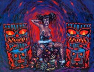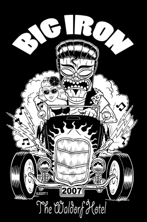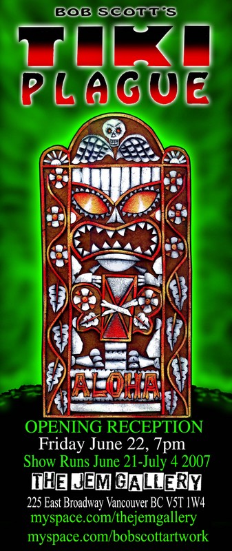 THE TIKI PLAGUE! Right now I'm finishing up my new series of over 40 tikis for my solo exhibit at The Jem Gallery I'm really excited to be having the first show of the summer in a really cool gallery space run by Carola Goetze and gallery assistant Holly Ruth Anderson .TIKI PLAGUE runs June 21-July 4 2007, and the opening reception is Friday june 22, 7pm which promises to be quite an event . The Jem Gallery is at 225 E. Broadway, Vancouver BC. My dad should be flying in for that one and hey, there is going to be a Bloody Fisted Patrick Swayze Tiki Bar Sign ! (You must watch him as Dalton in "Roadhouse" - hilarious!) 2 of my works will be printed in Electric Frankenstein's Sal Canzonieri's upcoming books "A Fistful of Rock & Roll" and a 2nd Electric Frankenstein Art Book! I am doing the cover art for a book by Drew Gates called The Crooked Beat, published by GFY Press. I am doing the poster art and T-shirt for BIG IRON a custom car and cycle show with an aftershow party in the Tiki Lounge at the Waldorf Hotel on august 11, 2007 .I have another interview coming up in the june issue of The Nerve Magazine to co-incide with the Tiki Plague. I am in a number of group art shows that pop up. I am confirmed for Frida Kahlo's 100th birthday Group Art show at Jem Gallery July 6th and to include work in "Lowbrow in the High Seas 4 " The pirate art show September 15th at Pat's Pub in Vancouver, the venue was to be the legendary Marine club but sadly it has closed! Also in the very early stages of putting together my 2009 Pin-Up Calendar. I hope to launch the calandar at a tie-in art show to exhibit the original work. In the future I will be doing some custom artwork on guitars for my friend Billy Bones at Sparrow Guitars in Vancouver which I am really excited to do! Anyone may contact me to commission a custom carving or artwork . My stuff is also currently available at the Jem Gallery Store and soon to be available Funhauser in Vancouver,"If Looks Could Kill art Boutique" in Calgary,and "Boutique Atomic" in Montreal. Looking to expand retail availability of my stuff by casting and molding pieces to distribute to retail locations abroad and working and making work available for purchase through my domain site (under construction) www.bobscottartwork.com I also do extra work for TV and film from time to time through Double Agents Talent in Vancouver which I find fun as well! Go to www.myspace.com/bobscottartwork for latest developments.